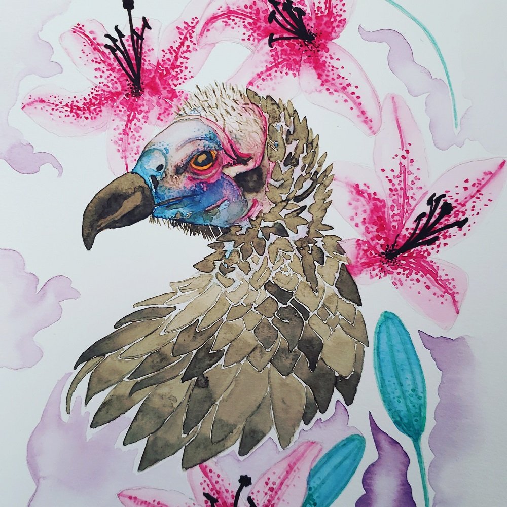 My primary medium is watercolor which allows me to paint both realistically and evocatively. I recently started exploring both acrylic painting and linocut printing. My work is informed by my fascination with nature in all its forms, as well as my introspective-analytical nature. I hold a particularly enduring love for vultures and for the world under the ocean.